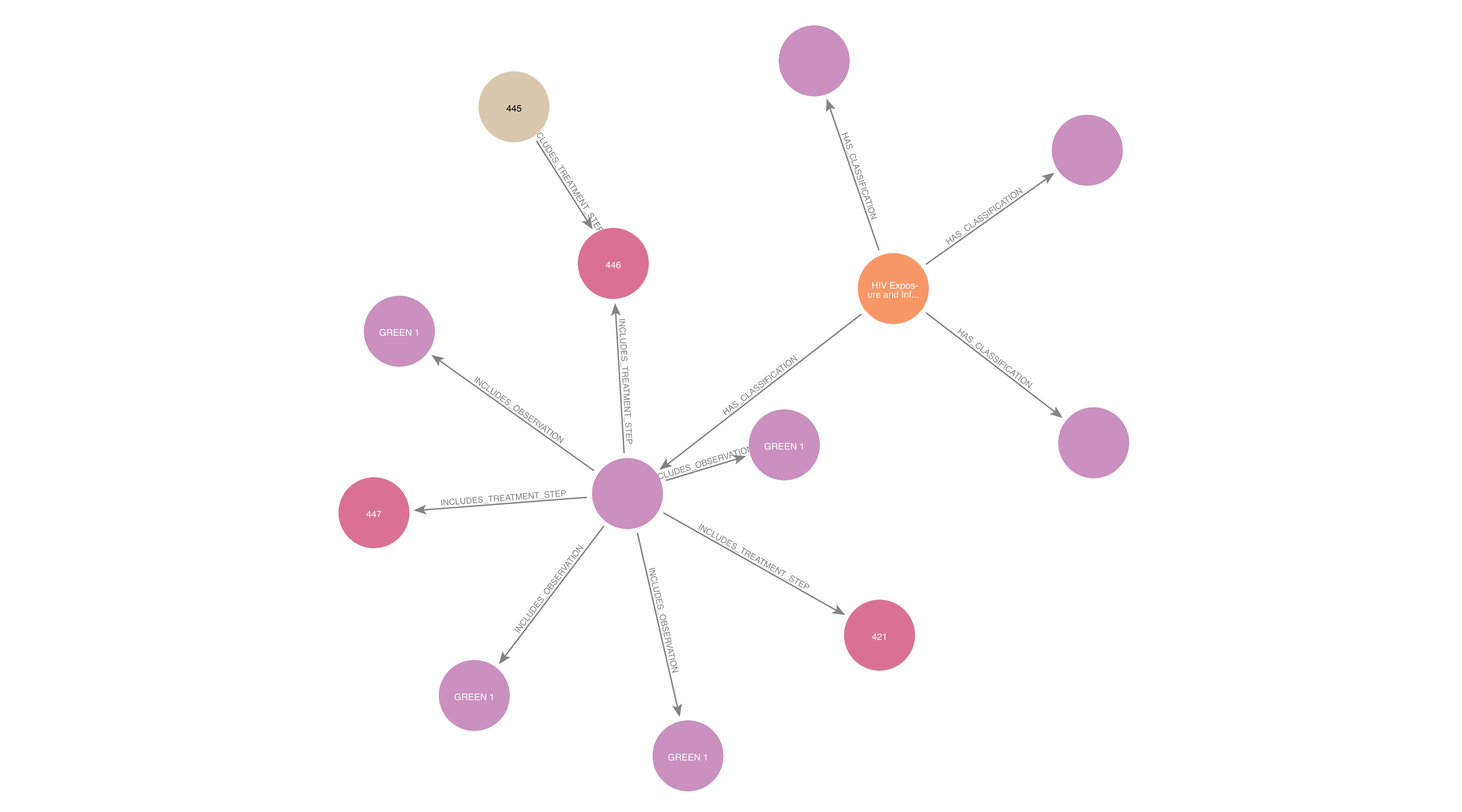 Example subgraph show the relationships between medical condition, classifications, observations, and treatment steps. Each node type is connected by edges that reflect the logical structure of the guidelines.