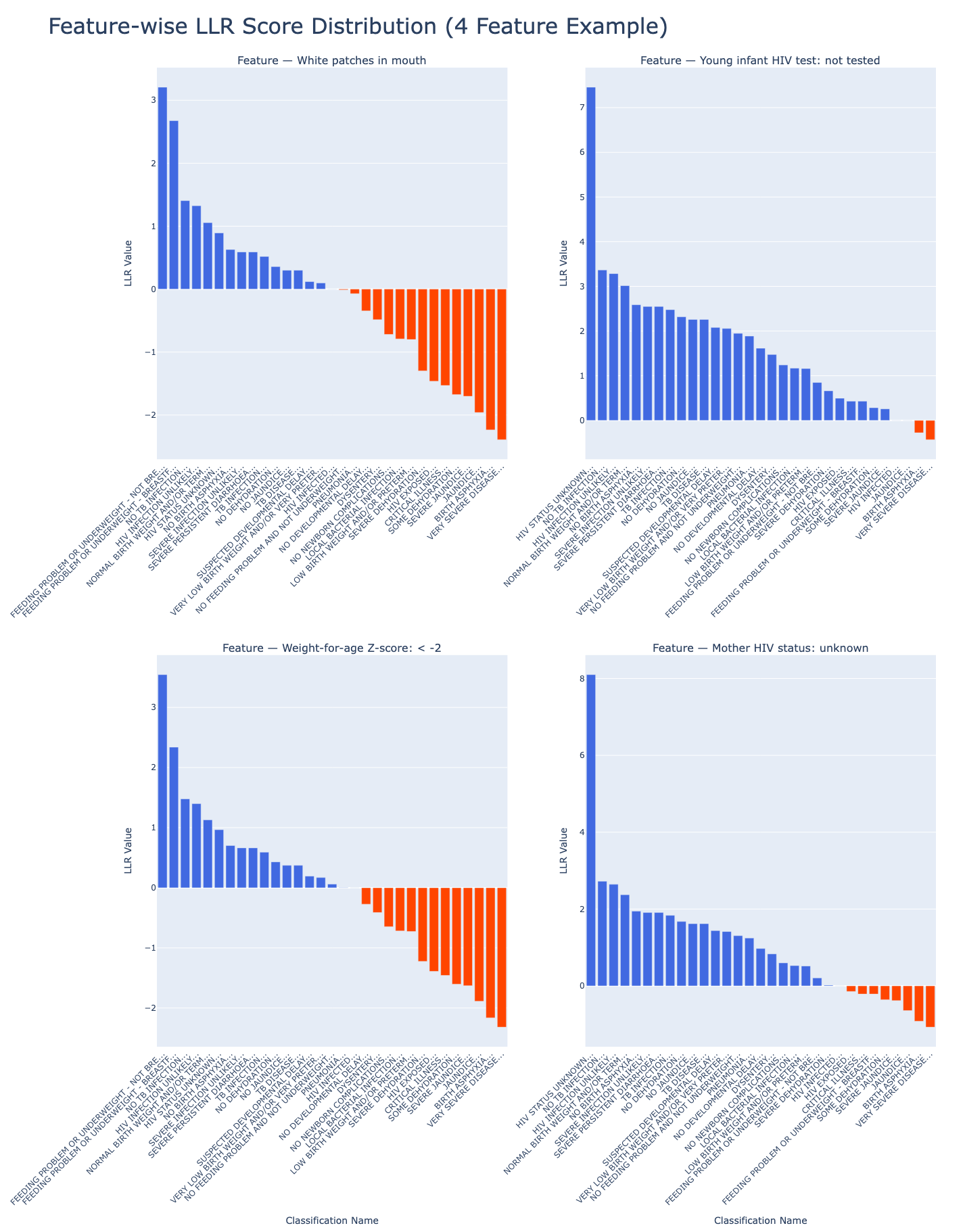 For each feature–classification pair, we compute an LLR—a measure of how strongly that feature supports (or contradicts) the diagnosis.